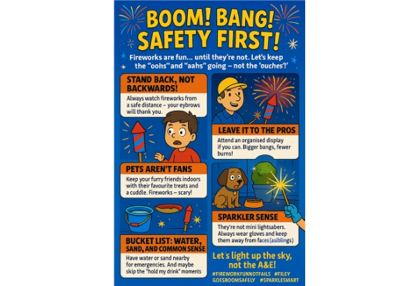 🔥 Top Tips for a Cracking (and Safe) Fireworks Night: 🎇 Stand Back, Not Backwards! Always watch fireworks from a safe distance – your eyebrows will thank you. 🧨 Leave It to the Pros Attend an organised display if you can. Bigger bangs, fewer burns! 🐾 Pets Aren’t Fans Keep your furry friends indoors with their favourite treats and a cuddle. Fireworks = scary! 🧯 Bucket List: Water, Sand, and Common Sense Have water or sand nearby for emergencies. And maybe skip the “hold my drink” moments. 👀 Sparkler Sense They’re not mini lightsabers. Always wear gloves and keep them away from faces (and siblings). 🚫 No DIY Fireworks Unless you’re a licensed pyrotechnician, step away from the rocket launcher.