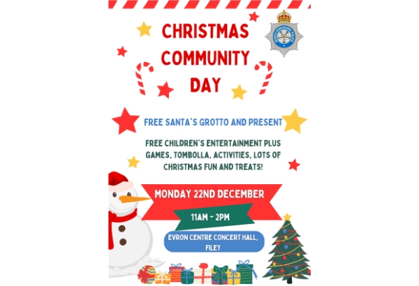 Organised by Filey police, We're bringing festive cheer to our community with a FREE Christmas celebration for everyone to enjoy during the school holidays! Monday 22nd December, Filey Evron Centre! 11am - 2pm!